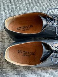 Eleganti mocassini in vera pelle blu, con lacci. Sulla parte anteriore forellini effetto traforato. Indossati pochissimo. Perfetti x occasioni informali o speciali. N.41. Cotton & Silk
