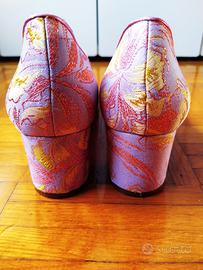 ELEGANTE MOCASSINO IN TESSUTO DAMASCATO COLORE ROSA E ORO. PUNTA TONDA, TACCO 5cm. TAGLIA 40 INDOSSATI UNA VOLTA