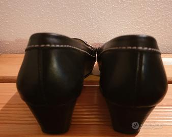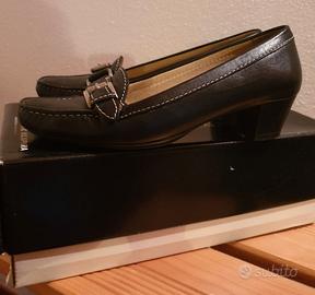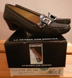 Mocassino Geox da donna, n°35, in pelle liscia nera, con fibbia e tacco cm.4, fondo traspirante.