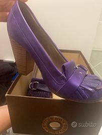 scarpe mocassino col tacco, colore viola “butterò”, usate ma ancora in buone condizioni. Modello elegante e comodo, perfetto per l’autunno o la primavera.