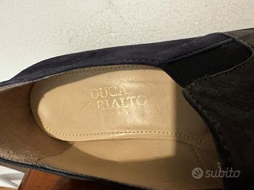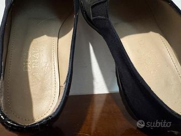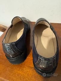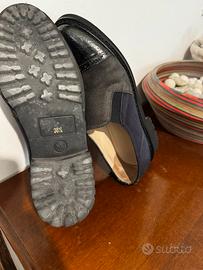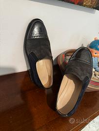 Mocassino in pelle, in parte verniciata altra scamosciata, dalla calzata comoda per lunghe passeggiate, mantiene una parte elegante pur essendo una scarpa informale, in un bellissimo tono di blu, colore elegante per antonomasia. Numero 38 e mezzo, usate solo un paio di volte, come si evince perfettamente dalle foto dove anche l’interno si vede, è perfetto.