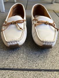 Mocassino estivo in pelle bianca con inserto con fiocco caramel. Marca Clarks