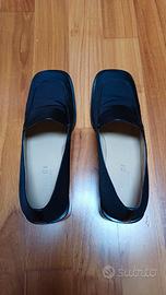 Raro e mocassino Gucci vintage da donna, realizzato oltre vent’anni fa, in tessuto nero con dettagli in pelle di vitello e suola in cuoio con inserto in parana. Un modello iconico, dal design senza tempo, che incarna perfettamente lo stile elegante e sofisticato della maison Gucci.