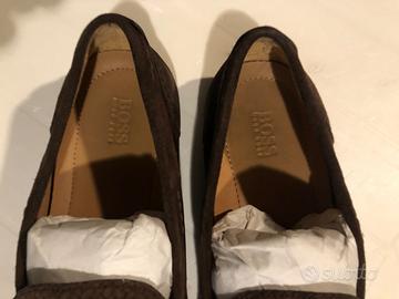 Mocassino marrone in pelle scamosciata, con punte intrecciate.