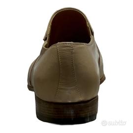 Elegante mocassino da uomo Moreschi in morbida pelle color beige chiaro, con punta affusolata e sottili profili a contrasto che slanciano la linea del piede. Modello slip-on con inserti elastici laterali nascosti per una calzata comoda e rapida, suola e tacco in cuoio con inserto in gomma per maggiore stabilità. Realizzato in Italia con finiture di pregio, è in ottime condizioni, con solo lievi segni d’uso sulla pelle e sulla suola, perfetto per completare outfit formali e cerimonia con un tocco raffinato e originale.