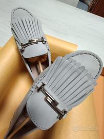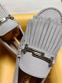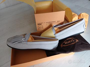 Mocassino Tod's originale, modello Gommino City, colore nebbia (B416 grigio), misura 36 e mezzo con frangia e doppia travetta in metallo simbolo T, usato solo per prova calzata. Prezzo negozio 600 euro circa. Contattare per qualsiasi informazione