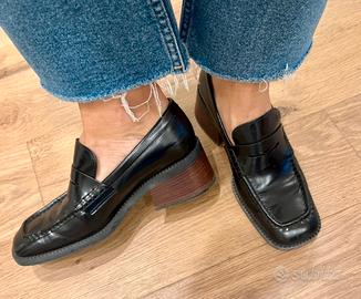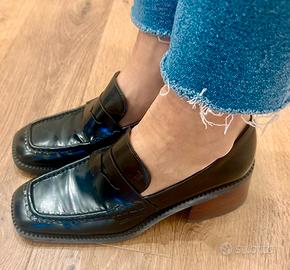 mocassino con tacco, in pelle liscia nera con mascherina e punta squadrata.