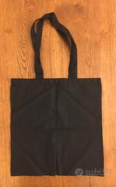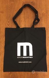 Modartech borsa quadrata in robusta tela nera di cotone con ampio logo in bianco, gadget dell’Istituto per la Moda con sede a Pontedera, Pisa. Nuova senza cartellino, cm 50x50.