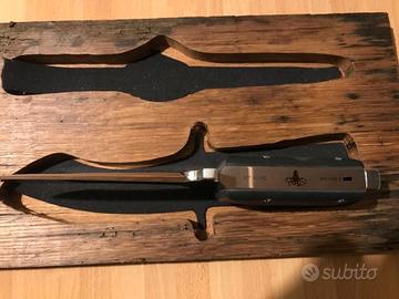 Orologio Squale modello Super Squale "Polipetto" con coltello Galeazzi in Ed. Limitata. Orologio e Coltello marchiati con la matricola del brevetto sommozzatore assegnato al personale del Nucleo Sommozzatori della Polizia di Stato. Caratteristiche: - Cassa in Acciaio - 200 Metri profondità / 21 Atm - Movimento Svizzero SW200 controllo elaborè - Diametro 40 mm - Vetro in esalite - Lunetta acciaio con inserto in alluminio - Ghiera girevole unidirezionale - Fondo acciaio serrato a vite con numero del brevetto Sommozzatore - Quadrante nero opaco - Indici applicabili - Inserti in superluminova - Lancette con doppio colore e superluminova Composto: - Cinturino in gomma vintage e Cinturino in cuoio fabbricati in Italia - Coltello Galeazzi in acciao inox con numero del brevetto Sommozzatore corredato di fodero in pelle nera - Scatola in legno del 1800 - Manuale con fotografie storiche - Card e certificato di garanzia - Copia del brevetto Sommozzatore - Made in Italy L'orologio Super Squale 40mm è un modello che la Squale produceva negli anni 60, attualmente non è più in produzione. È stato realizzo in serie Limitata (Solo 62 Esemplari) in esclusiva per il Nucleo Sommozzatori della Polizia di Stato per ricordare gli anni dei record di profondità. Lo stesso modello è stato indossato e utilizzato da Enzo Maiorca per i suoi record di profondità assistito, per le prove, dal Nucleo Sommozzatori della Polizia di Stato. Le casse, dei fondelli. utilizzate sono quelle originali degli anni sessanta Per l'occasione è stato prodotto, anche, il famoso coltello della Galeazzi (Sono stati ripresi i vecchi cliché ) che in quel periodo era in dotazione al nucleo Sommozzatori della Polizia di Stato. Il tutto viene fornito in una scatola in legno del 1800, opportunamente trattata, dove sono stati impressi i loghi e il numero progressivo con ganci in ottone rendendo il tutto più magico. Orologio e coltello contraddistinto da numero di matricola del brevetto sommozzatore.
