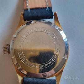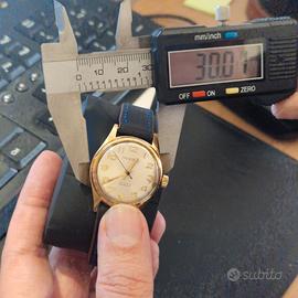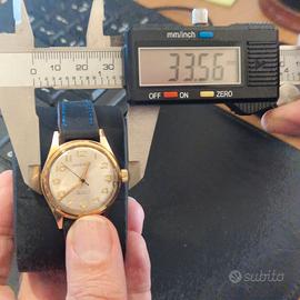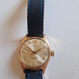 Orologio di produzione Moeris '50. Quadrante con finitura soleil (a raggio di sole) mostra un'ossidazione naturale coerente con l'età. La stampa del logo 'MOERIS' e delle diciture '21 RUBIS INCABLOC' è nitida e tipograficamente corretta per il periodo. Gli indici numerici applicati in oro e le sfere a bastone mostrano una patina uniforme. La presenza della dicitura 'SWISS' a ore 6 è correttamente posizionata. La cassa placcata oro mostra segni di usura sui bordi delle anse, rivelando il metallo sottostante, un fenomeno tipico degli orologi vintage di questa fascia. Il diametro di circa 33.5mm è standard per l'epoca. Fondello: Il fondello a vite in acciaio inossidabile presenta le incisioni corrette ('SHOCKPROTECTED', 'WATERPROOF', 'ANTIMAGNETIC') con la profondità e lo stile tipici della manifattura svizzera dell'epoca. E' Moeris solo tempo che purtroppo NON FUNZIONA. Moeris è un marchio storico rispettato, il valore è influenzato positivamente dalla presenza del sistema Incabloc e dai 21 rubini, che indicano un movimento di qualità superiore rispetto ai modelli base da 15 o 17 rubini. Moeris Fondata nel 1893 a Saint-Imier, è stata una manifattura svizzera di grande rilievo, nota per la precisione dei suoi calibri. Durante la Seconda Guerra Mondiale, fu uno dei fornitori ufficiali di orologi per l'esercito britannico (i celebri 'Dirty Dozen'). Negli anni '50, come l'esemplare in esame, Moeris si concentrò su orologi eleganti e robusti per il mercato civile, prima di essere assorbita da Tissot (gruppo SSIH) negli anni '70.