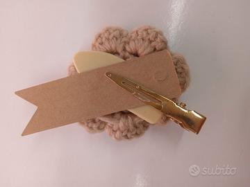 Molletta a pinza con fiore in lana doppio colore (marrone e nocciola) e strass acrilice quadrato centrale.