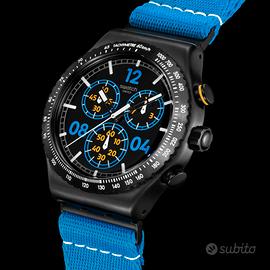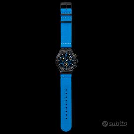 Questo cronografo sportivo presenta un quadrante nero con finitura spazzolata soleil, indici stampati in bianco che si illuminano al buio e numeri stampati in blu e giallo. Le lancette delle ore e dei minuti nere che si illuminano al buio e la lancetta dei secondi bianca indicano l'ora. La cassa in acciaio inossidabile spazzolato con PVD nero è completata da una lunetta in tinta con scala tachimetrica incisa in bianco. Completano l'orologio un cinturino in tessuto blu con passanti e mezza fibbia in acciaio inossidabile spazzolato, entrambi con PVD nero.