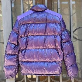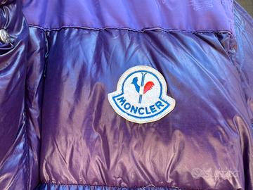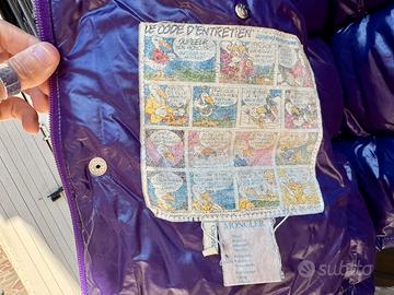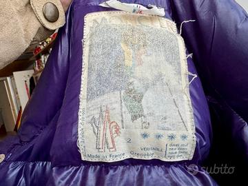 Bellissimo piumino Moncler Grenoble originale degli anni ‘80, colore viola, taglia 2 (una M), un simbolo dei paninari, ancora con un piumaggio perfetto come si vede dal gonfiore dell’imbottitura. Come visibile in foto ha solo un piccolo riporto di stoffa sulla manica sinistra ma che essendo dello stesso materiale lucido quasi non si vede o comunque sembra una applicazione originale.