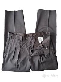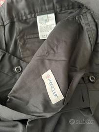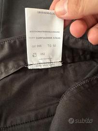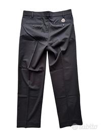 Pantaloni eleganti di Moncler. Di colore nero, in tessuto elasticizzato di lana vergine/poliestere. Costruzione sartoriale, chiusura con bottoni, 2 pinces frontali. 2 tasche laterali, 2 tasche posteriori con chiusura a bottone. Taglia IT50, vestibilità regolare. Lunghezza 112cm, Cavallo 79cm, Orlo 23cm, girovita 47cm, fianchi 58cm circa. Articolo nuovo, mai usato o indossato. Consegnato con etichette, senza fattura né confezione.
