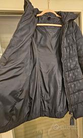 Modello avvitato per il classico piumino con cappuccio. Tessuto blu con fantasia a pois in tono colore. In ottime condizioni, usato pochissimo.