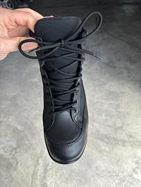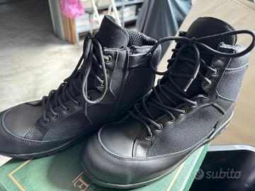 Scarpa Militare altezza media mod. "NAVY" taglia 43 in pelle di vitellone al cromo, colore nero, idrorepellente, con gambetto in tessuto di filato in poliammide 100% accoppiato con tessuto traforato 100% poliestere. Fodera in tessuto tridimensionale 100% poliestere, di cui lo strato esterno è forato e lo strato sottostante è più compatto. Soffietto parte superiore e collarino in pelle bovina molto morbida, idrorepellente e traspirante, puntale anti schiacciamento in acciaio, suola gomma, sottopiede anti perforazione in tessuto. Allacciatura mediante lacci passanti in occhielli metallici e dispositivo di sfilamento rapido e cerniera. Lavorazione ad ago. La linea Military offre prodotti studiati appositamente per le situazioni critiche dei servizi di difesa Nazionale. Dai paracadutisti ai vigili del fuoco, dagli incursori ai piloti, dai marinai agli alpini, per tutti il prodotto giusto per essere pronti al servizio in ogni ambiente di intervento. Quando sei impegnato a proteggere la Nazione, noi pensiamo a proteggere te. Per altre info o foto non esitate a contattarmi. Grazie