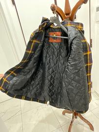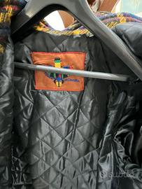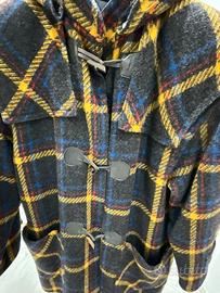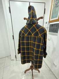 Montgomery donna colore grigio scuro a righe blu, rosse e gialle indossato poche volte con cappuccio staccabile e alamari. Interno imbottito. Lunghezza montgomery 63 cm. Lunghezza maniche 48 cm. Vestibilita’ comoda (taglia 46).