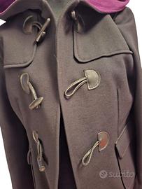 Stupendo MONTGOMERY MOSCHINO nero, con cappuccio, tg 44/46. Chiusura alamari, foderato internamente in pile viola. Idrorepellente. Come nuovo, usato raramente.