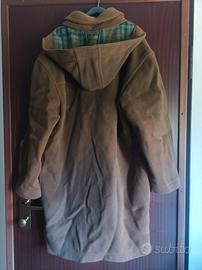 Montgomery uomo (Cod A11), marca Castiglioni -Roma, made in Italy, colore cammello. Rivestimento fodera trapuntata, cappuccio staccabile. 2 tasche interne con zip. Si abbottona con alamari leggermente "vissuti". Senza targhetta tessuto credo lana, pesante, caldo e ben rifinito. Qualche pelucco di utilizzo sulle parti di attrito (colletto e maniche). Risvolto interno tasca dx un po' consumato. Senza targhetta tg, credo XL, misure: spalle 56, ascelle 70, lunghezza 107, manica 60. Ha bisogno di una stirata in tintoria. Ottime condizioni, non spedisco INPOST
