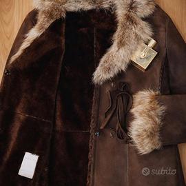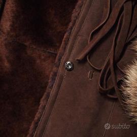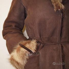 👉Splendido montone Belfe ORIGINALE in vera pelle scamosciata color marrone caldo, con collo e polsini in pelliccia naturale.