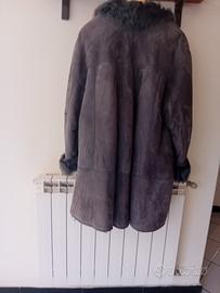 montone Shearling donna colore grigio con interno in pelliccia. arriva al ginocchio. modello svasato. misura xl/ 46.spalle 54 giro ascelle104.taglia 46