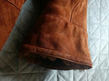 Montone da donna di Goitre Pelle. Taglia approssimativa 46-48 italiana (Vedi foto per le misure). Di color cognac/ marrone. Chiusura a bottone; cappuccio rifinito in volpe; lacci intorno al collo per fissare il cappuccio. Montone ben tenuto e di ottima qualità. Complessivamente in ottime condizioni, da segnalare dei lievi segni di usura sul camoscio esterno (vedi foto). Per il resto in condizioni perfette.