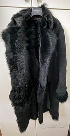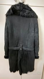 Il capo è realizzato in pelle scamosciata all'esterno, interno foderato in pelliccia,con revers,polsini con bottone e bordi in pelliccia, chiusura con cintura e bottoni.Indossato ma in ottime condizioni,tranne la fibbia della cintura leggermente usurata