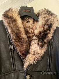 Montone uomo vintage vera pelle usato poche volte , molto bello e molto caldo , è una tg 56 ma veste dalla xl alla xxl essendo stile bomberone , in caso contattare per avere la misura in cm