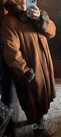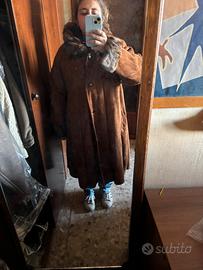 Bellissimo montone vintage, caldo, perfetto, collo e maniche in pelliccia, piccolo segno di usura vicino alla tasca destra, taglia 44