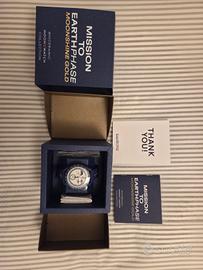 orologio moonswatch moonshine gold edizione limitata di agosto, venduto in pochi swatch store un solo giorno. nuovo mai indossato con pellicola protettiva, acquistato allo swatch store di Firenze. Questo cronografo presenta una cassa, una corona e pulsanti in Bioceramic blu navy, abbinati a un cinturino in caucciù blu navy e a un passante in Bioceramic. Ha un quadrante bianco opalescente con indici delle ore rivestiti in Super-LumiNova® di grado A (emissione verde). Nella posizione delle ore 10, l'indicatore della fase terrestre mostra la Terra con gli oceani che si illuminano di blu se esposti alla luce UV. Sotto l'indicatore della fase terrestre c'è un'illustrazione di Snoopy e Woodstock sulla Luna, che ammirano incantati lo spettacolo affascinante della Terra. L’illustrazione presenta una frase che appare solo alla luce ultravioletta. Nel quadrante secondario a ore 2 è presente un indicatore di fase lunare con due radianti lune piene, entrambe rivestite di OMEGA’s Moonshine™ Gold. Una delle lune è stata disegnata nello stile caratteristico del mondo di Snoopy, mentre l'altra è ricoperta da un motivo a rete, in un giocoso riferimento alle origini della Luna dello storione, la luna piena che apparirà durante il mese di lancio di questo orologio. Il copribatteria presenta un design ispirato alla Terra, mentre il cinturino in caucciù navy con chiusura VELCRO® aggiunge un tocco di eleganza astronautica. Tutti i quadranti della collezione recano il marchio OMEGA X Swatch, l'iconico logo Speedmaster e il logo MoonSwatch. La forma bombata del vetro biosourced, la "S" incisa al centro che richiama il logo Swatch, il raffinato e sofisticato motivo circolare sull'anello esterno del quadrante e sui quadranti secondari incassati, la struttura angolare e armoniosa delle anse e, naturalmente, l'esclusiva sensazione al tocco del Bioceramic sono comuni a tutti i modelli. Gli indici, le lancette delle ore e dei minuti e la punta della lancetta dei secondi cronografici sono rives
