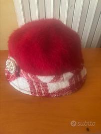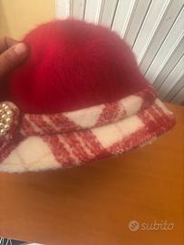 Morbido cappello da donna in lana. - Dettaglio decorativo con perle e strass. - Fantasia a quadri rossa e bianca.