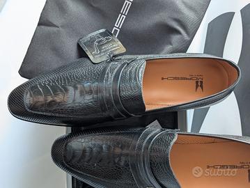 Eleganza, rarità e artigianalità italiana da collezione. Vendo esclusivo paio di mocassini Moreschi, realizzati a mano in Italia con una sofisticata combinazione di pellami pregiati. Ideali per eventi di lusso, cerimonie e matrimoni all'aperto. Appartenenti alla manifattura storica della gestione originale della famiglia fondatrice a Vigevano. Oggi ricercatissimi dagli intenditori per la superiorità dei materiali rispetto alle produzioni recenti. Caratteristiche: - Materiale: corpo in pregiata pelle di canguro con lavorazione laser-cut (micro-forata, estremamente leggera e resistente) per la massima traspirabilità, con inserti frontali in vera zampa di struzzo a scaglie naturali. Una combinazione rara che unisce comfort tecnico e lusso esotico. - Colore: Nero intenso. - Taglia: 8.5 UK (Calzata comoda Moreschi, ideale per un 42.5 o 43 EU). Condizioni: NUOVE (Deadstock), mai indossate. Suola in cuoio intonsa. Corredo e Autenticità: Le scarpe sono vendute Full Set, includendo: - Scatola originale Moreschi. - Dust bag (sacchetto protettivo) in tessuto logato. - Cartellino di autenticità del pellame esotico. - Talloncino originale di controllo qualità (Quality Check) della manifattura. Un pezzo di altissimo livello, perfetto per chi cerca una calzatura distintiva e di qualità superiore. Prezzo retail in boutique: circa 1.200€. ____________________________________________ Luxury Moreschi Loafers - Kangaroo & Ostrich Leg Leather - Size 8.5 UK Up for sale is a stunning pair of handmade Moreschi loafers, combining two of the finest leathers in the world. Materials: Main body crafted from premium laser-cut Kangaroo leather (famed for its extreme lightness and durability) with genuine Ostrich leg leather accents on the front. Condition: Brand New in Box (Deadstock). Never worn. Full Set includes: Original box, branded dust bag, authenticity tags, and factory quality control slip. Fit: Size 8.5 UK (fits like a comfortable 42.5 or 43 EU). Origin: 100% Made in Italy.