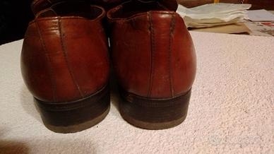 mocassino uomo originali misura 42, colore cognac, vera pelle suola in cuoio tacco cm 2,5, unico difetto è la fibbia sinistra è senza vernice nera, usata pochissimo, interno fodera in pelle integra