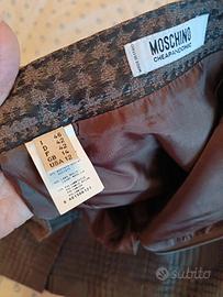 Completo vintage MOSCHINO CHEAP AND CHIC composto da giacca e gonna a tubino in tessuto con motivo jacquard pied-de-poule nero e marrone leggermente brillante, in misto lana acetato e poliammide. La giacca / blazer è a tre bottoni con revers a contrasto beige con pieghe decorative; la gonna è un modello a tubino aderente con piccolo spacco sul davanti. Taglia indicata IT46, si vedano le seguenti misure, prese a piatto: