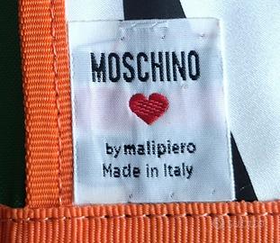 Vendo raro portafoglio vintage di MOSCHINO. Il materiale di cui e fatto è nylon di colore giallo e nero,bordato di arancione. All'intrrno invece sono presenti i colori bianco e nero,sulla dx,giallo e nero sulla sx,e il verde al centro e nel vano più grande.Nella parte frontale vi è una patch a forma di cuore, bordato con i colori bianco e rosso con all'interno il simbolo della pace. Al centro invece vi è raffigurata una giraffa con la corona,e una bandiera con i colore dell'italia. Lo stato di conservazione generale è ottimo. Misure: Chiuso: 11 x 10. Aperto: 20 x 11. Si effettuano spedizioni a carico del destinatario. Prezzo: 90€