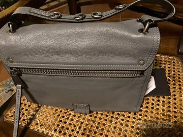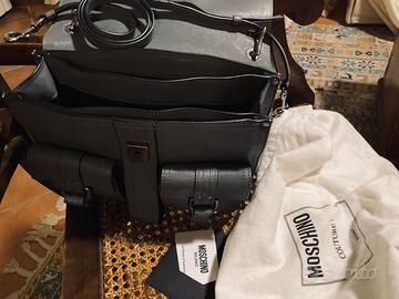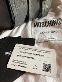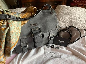Borsa in vera pelle colore grigio di Moschino couture , completa di cintura per tracolla , tre scomparti con +2 tasche sul davanti , sacchetto stoffa , bustina originale con certificato di garanzia , indossata una sola volta . Misure