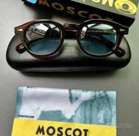 Vendo occhiali da sole MOSCOT, con elegante montatura marrone effetto tartaruga e lenti scure.