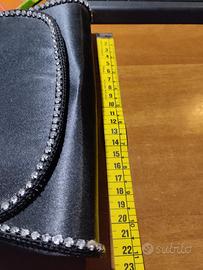 Motivi pochette nera di raso e strass. sul retro della borsa e sotto la chiusura manca uno strass, ma sono in posizione non visibile