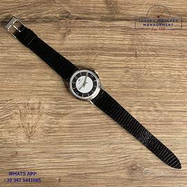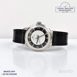 Movado Classic vintage acciaio, anno di produzione circa 1950, ghiera acciaio liscia, vetro plastica, quadrante bianco e nero bicolore Movado dell’epoca, indici arabi e sfere a bastone, movimento manuale meccanico, cinturino colore nero pelle di lucertola con fibbia in acciaio generica.