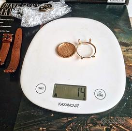 Cassa oro solido 18 kt, lancette e indici oro, logo stampato a ore 12.