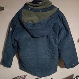Giaccone imbottito e impermeabilizzato in cotone, cappuccio staccabile, chiusura con zip e bottoni in alluminio.