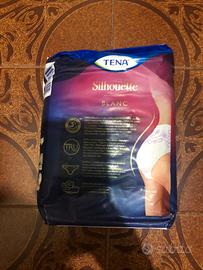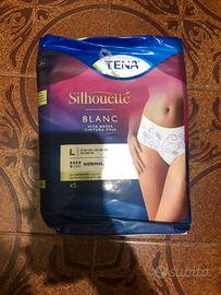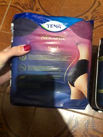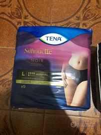 2 confezioni di mutandine assorbenti marca Tena tipo Silhouette, taglia L, una colore nero e l’altro bianco. Confezioni nuove chiuse.