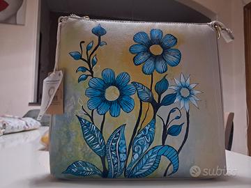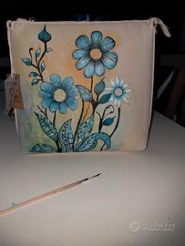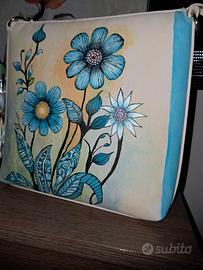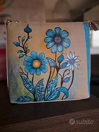 borsetta Carpisa con ancora il cartellino interamente dipinta a mano e da rifinire (mancano dettagli banda blu laterale, fiore centrale e vernice finale)