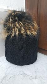Cappello in pura lana Merino, fatto ai ferri. Pon pon in pelliccia vera. Nuovo