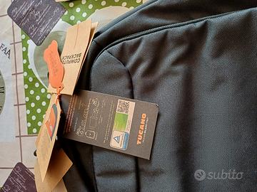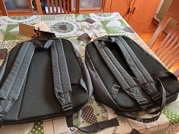 N.2 zaini marca Tucano in plastica riciclata, in tessuto grigio con dettagli arancioni a contrasto, dotati di un reparto imbottito per eventualmente laptop o talete di 15,6 pollici, tracolle regolabili imbottite e comparto frontale multitasche, utilizzabili per svariati compiti, dimensioni cadauno cm.30x13x42, nuovi con etichetta, cadauno euro 18,00 a stock euro 30,00