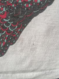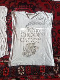 Vendo in blocco n. 5 T-shirt Happiness bianche smanicate con maniche arrotolate. Temi: - grafica "distressed" con la scritta "BLACK FLAGS" in alto, una fusione tra la bandiera degli Stati Uniti e la Union Jack al centro, e la frase "SPEAK IN ENGLISH" capovolta in basso. Veste stretto. - stampa grafica centrale di ungufo stilizzatodai dettagli intricati, simile a un mandala. Veste stretto. Piccolo buco sulla parte frontale vicino al gufo come da foto. - hrafica con la scritta"JIMMY CHOOF CHOOF"sormontata da una nuvola di fumo stilizzata e l'immagine di una scarpa capovolta in basso. Veste stretto. - grafica frontale di unbouquet di rosein stile sketch. Il design è caratterizzato da rose multiple con gambi spinosi legati insieme, realizzati in toni di grigio e nero. Veste stretto. - grafica di un sandalo gioiello con cinturino alla caviglia e la scritta "Cinderella loves Manolo". Veste stretto.