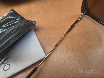 Vendo in lotto n 2 occhiali da sole da donna, stile cat-eye. Uno marchio Crullè polarizzato e specchiato, usato pochissime volte perché mi è grande; uno marca Nau usato ma ancora in ottimo stato, con un leggero graffio su una lente che non compromette assolutamente l'utilizzo. Risulta sprovvisto di poggia naso che sono saltati via poco dopo, probabilmente per un difetto di fabbrica, uno però l'ho recuperato, è solo da incollare. Entrambi gli occhiali hanno le montature in plastica rigida resistente, color oro. Ho altri occhiali in vendita