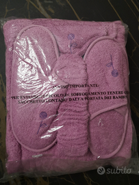 Naj Oleari coordinato da bagno composto da accappatoio (con cappuccio, tasche e cintura), una fascia per capelli, un guanto da bagno e un paio di ciabattine. Realizzato in puro cotone 100% da 340 GSM, il coordinato è decorato da un fiore ricamato di colore viola. Accappatoio e ciabattine sono taglia unica. Nuovo, mai usato, ancora nella confezione originale. Da aggiungere spese di spedizione (consegna a mano disponibile nel comune di Terracina, Latina o Roma zona Tor Vergata/Domus)