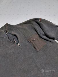 Cotone pesante a maglia inglese, con inserti sui gomiti e tasca anteriore. Taglia M, ma veste abbondante.