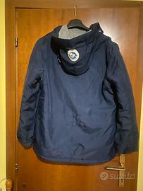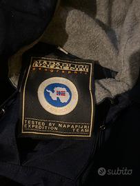 Condizioni molto buone. Giacca Napapijri Rainforest originale, versione invernale con interno in pile caldo. Colore blu scuro con logo frontale e patch expedition. Molto resistente e ideale per inverno e streetwear.
